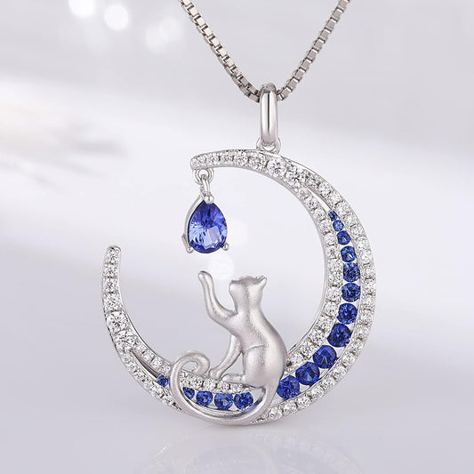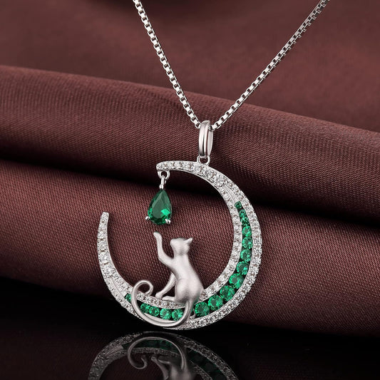 Lovely Cat Necklace for Women, 925 Sterling Silver Cat on Moon Necklace with 5A+ Cubic Zirconia, ...